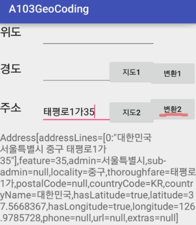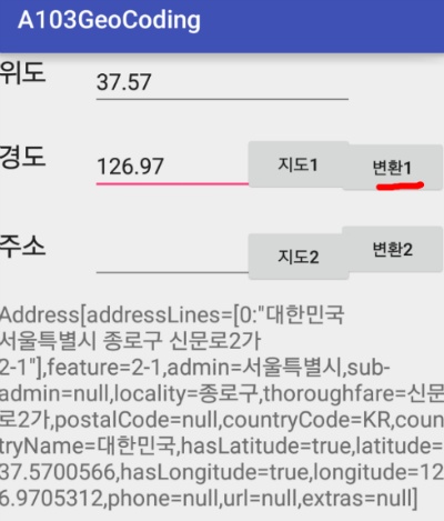 반면 상단의 위도, 경도 값을 직접 입력하고 [변환1] 을 누르면 이또한 지오코딩이 된 결과값이 나옵니다.