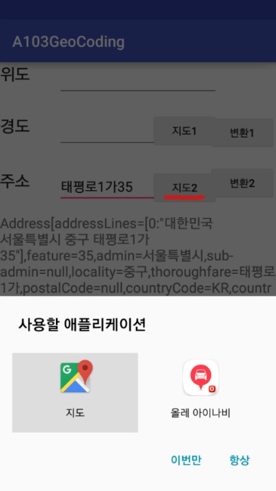 한변 [지도2] 버튼을 누르면, 아래와 같이 지도 앱으로 묵시적인텐트를 날려서