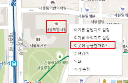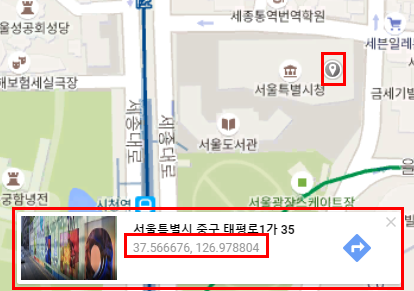사실 이런 서비스는 이미 구글맵 등에서도 제공되었죠. 구글맵에서 특정 지점 위에서 마우스우클릭 - '이곳이 궁금한가요?' 실행하면 위도, 경도 가 나왔죠.