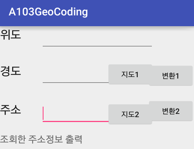 두가지를 해볼거고, 각각에 대해 변환된 문자열 출력과, 변환된 위도,경도 좌표를 통해 지도를 보여주는 것을 구현해봅니다. 이때 지도는 묵시적 인텐트 (implicit intent) 로 호출합니다. (묵시적 인텐트 에 대해서는 지난 포스팅 참조 → 클릭)