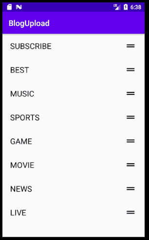 1 2 3 4 5 6 7 8 9 10 11 12 13 14 15 16 17 18 19 20 21 22 23 24 25 26 27 28 29 30 31 32 33 34 35 36 37 38 39 40 41 42 43 44 45 46 47 | public class MainActivity extends AppCompatActivity { private RecyclerView mRecyclerView; private TabListAdapter mAdapter; private ItemTouchHelper mItemTouchHelper; @Override protected void onCreate(Bundle savedInstanceState) { super.onCreate(savedInstanceState); setContentView(R.layout.activity_main); mRecyclerView = (RecyclerView) findViewById(R.id.rv_tab_list); LinearLayoutManager manager = new LinearLayoutManager(getApplicationContext()); manager.setOrientation(LinearLayoutManager.VERTICAL); mRecyclerView.setLayoutManager(manager); mAdapter = new TabListAdapter(); mRecyclerView.setAdapter(mAdapter); mItemTouchHelper = new ItemTouchHelper(new ItemTouchHelperCallback(mAdapter)); mItemTouchHelper.attachToRecyclerView(mRecyclerView); ArrayList<TabItem> items = new ArrayList<>(); TabItem item1 = new TabItem("SUBSCRIBE",0); TabItem item2 = new TabItem("BEST",0); TabItem item3 = new TabItem("MUSIC",0); TabItem item4 = new TabItem("SPORTS",0); TabItem item5 = new TabItem("GAME",0); TabItem item6 = new TabItem("MOVIE",0); TabItem item7 = new TabItem("NEWS",0); TabItem item8 = new TabItem("LIVE",0); items.add(item1); items.add(item2); items.add(item3); items.add(item4); items.add(item5); items.add(item6); items.add(item7); items.add(item8); mAdapter.setItems(items); } } http://colorscripter.com/info#e" target="_blank" style="color:#4f4f4ftext-decoration:none">Colored by Color Scripter | http://colorscripter.com/info#e" target="_blank" style="text-decoration:none;color:white">cs |