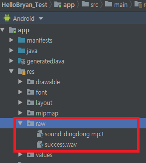 우선 res > raw 폴더에 sound file 을 넣습니다. (모두 소문자로! 대쉬(-)는 언더바(_)로 바꾸고)