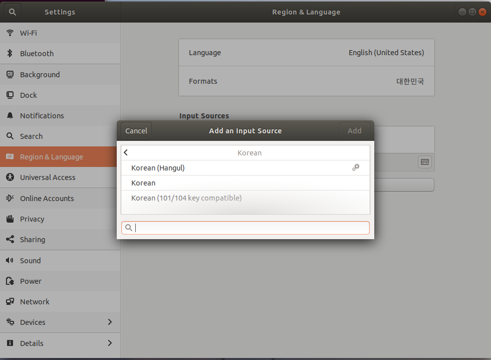 다음으로 Settings -> Region&Language -> Add an Input Source 에서 Korean(Hangul)을 추가해준다.