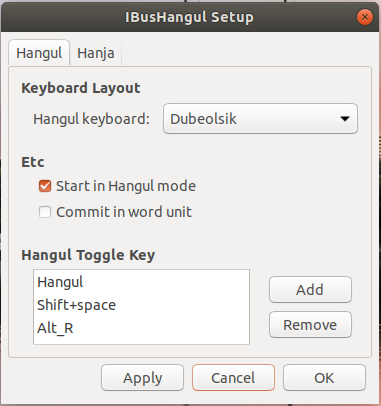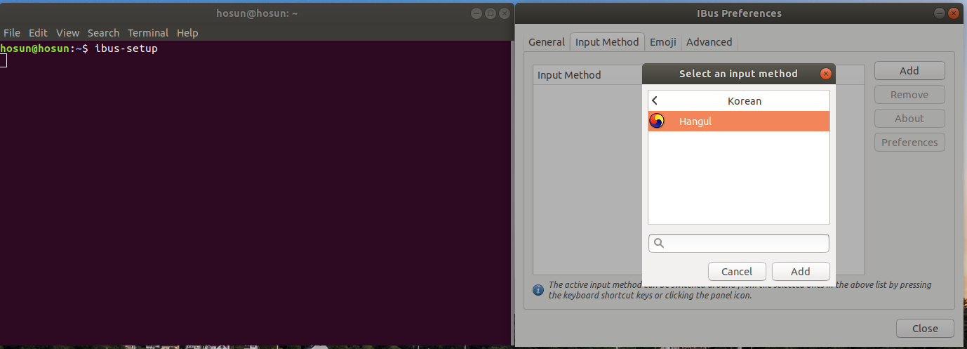 재부팅이 되고 나면 터미널 창에 다음과 같이 입력하고, Input Method -> Add -> ... -> Korean -> Hangul 을 추가한다.