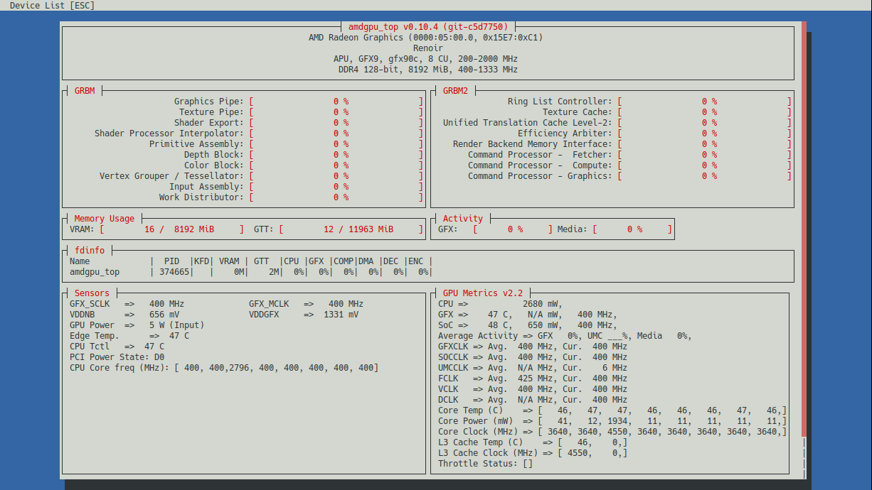 amdgpu_top은 AMD GPU의 사용률, 온도, 메모리 사용량 등을 실시간으로 확인할 수 있는 TUI 기반 도구입니다.